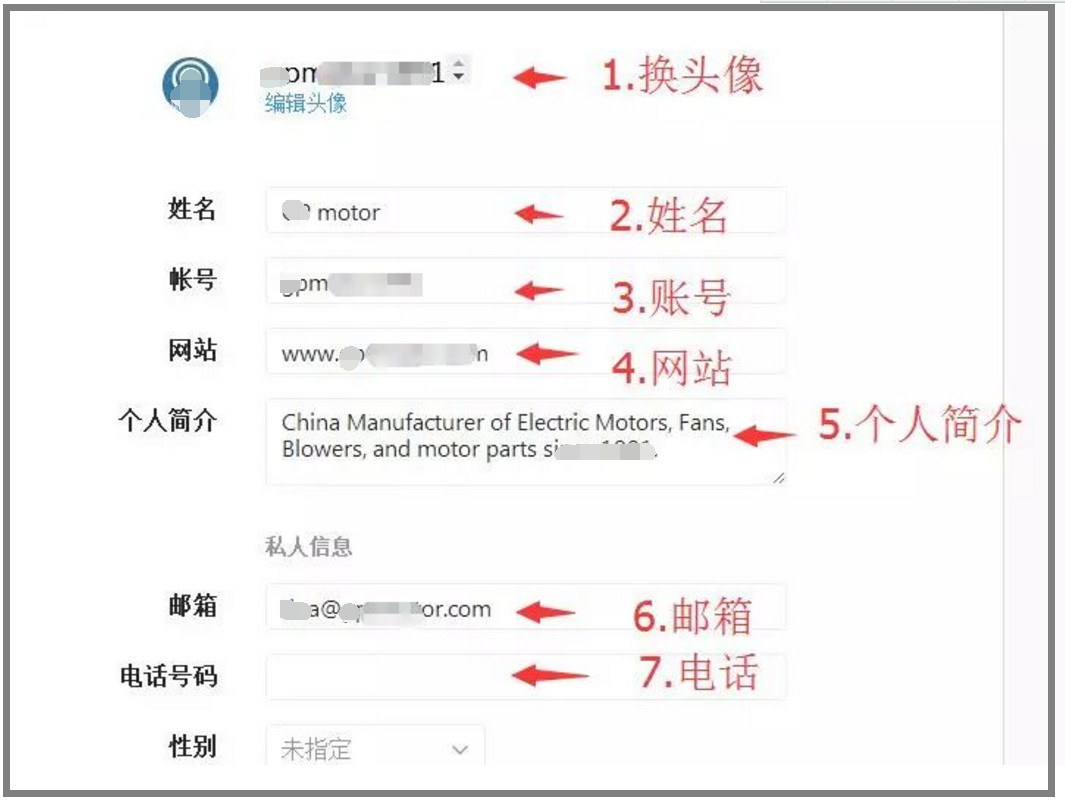 再點擊,全名旁邊的 "編輯個人主頁”,開始編輯你的個人信息。1)頭像。2)姓名。3)賬號。4)網(wǎng)址。5)簡介。6)郵箱。7)電話。
